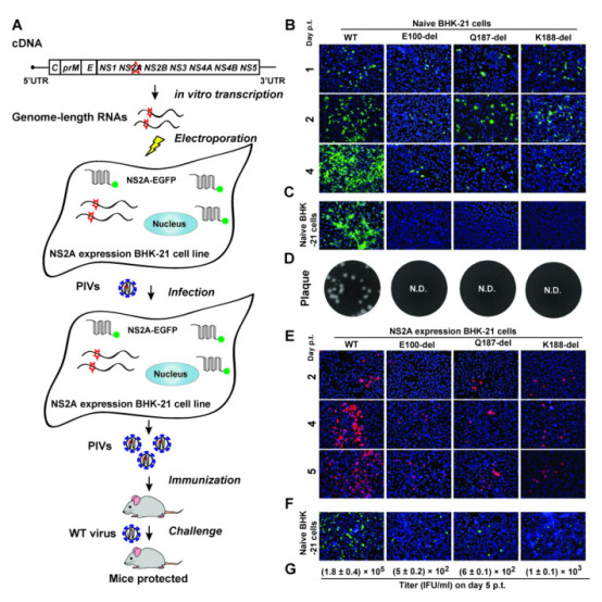 研究人員已改造后的DENV毒株為新疫苗開發(fā)平臺,通過使用反向互補補充方法,將DENV野毒株的非結(jié)構(gòu)蛋白2A(NS2A)整合進候選疫苗株內(nèi),拯救出弱感染力的DENV毒株-PIV?NS2A。對PIV?NS2A進行培養(yǎng)發(fā)現(xiàn),其細胞感染率能達到107?IFU/ml,通過免疫小鼠發(fā)現(xiàn),PIV?NS2A能夠刺激機體T細胞免疫反應(yīng)及產(chǎn)生高效價的中和抗體,抵抗DENV野毒株的感染。